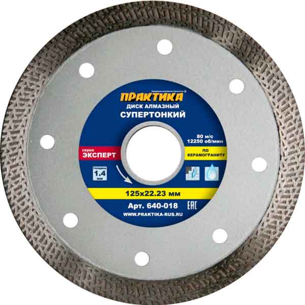 Диск предназначен для резки керамической облицовочной плитки. Устанавливается на угловую шлифмашину. Рекомендуется работать с охлаждением водой.