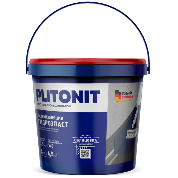 Готовая к использованию эластичная мастика Плитонит ГидроЭласт, в фасовке 4.5 кг, предназначена для устройства сплошной бесшовной гидроизоляции строительных конструкций и сооружений внутри и снаружи зданий (душевые, ванные, туалеты, прачечные и другие влажные помещения) перед производством дальнейших облицовочных работ. Применяется как для работ по бетону, штукатурке, кирпичной кладке, так и для защиты невлагостойких покрытий: гипсокартона и гипсовых штукатурок во влажных помещениях. Возможно использование в системе полов с подогревом.