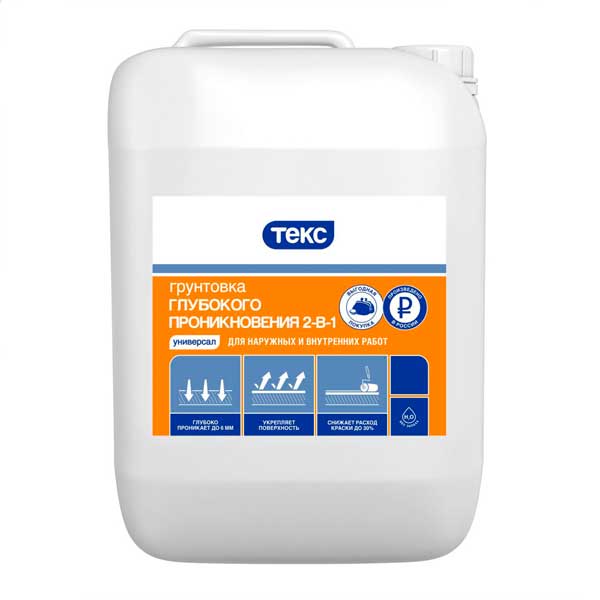 Грунтовка 2 в 1 глубокого проникновения, Текс Универсал, 10 л — грунтовка для внутренних работ, глубоко проникает в поверхность, улучшает сцепление покрытия с поверхностью, выравнивает впитывающую способность поверхности и снижает расход краски. Она глубоко проникает в поверхность, выравнивает впитывающую способность поверхности и снижает расход краски. Наносится кистью, валиком или распылителем.