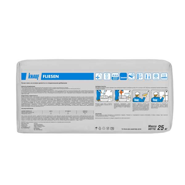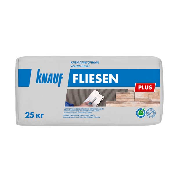Клей плиточный усиленный КНАУФ-Флизен Плюс на основе цемента со специальными добавками. Предназначен для облицовки внутри и снаружи зданий (включая цоколь):