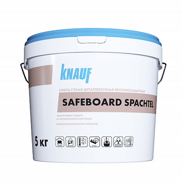 Шпаклевка КНАУФ-Сейфборд Шпахтель – сухая гипсовая смесь с добавлением специальных компонентов, обеспечивающих защиту от рентгеновского излучения. С целью идентификации окрашена в желтый цвет, также, как и сердечник листов КНАУФ-Сейфборд.