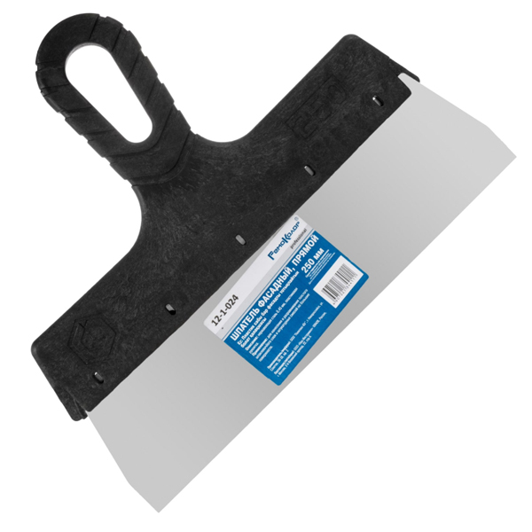 Фасадный шпатель РемоКолор 12-1-024 изготовлен из нержавеющей стали с пластиковой рукояткой. Толщина стали – 0,45 мм, а ширина шпателя составляет 250 мм, что позволяет комфортно разравнивать раствор на большой по площади поверхности, чтобы получить ровное основание для последующей отделки.