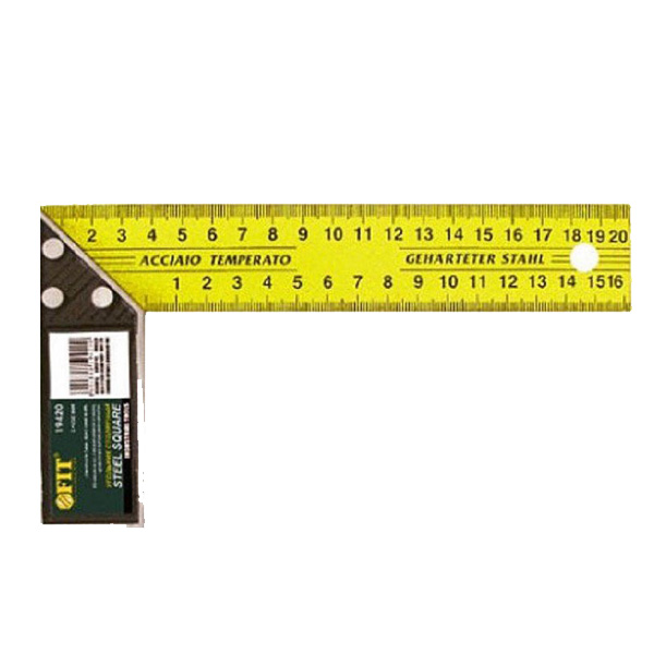 Столярный металлический угольник FIT Профи 19435, диной 350 мм, предназначен для выполнения измерительных работ, а также проверки прямых углов на соответствие 90°. Инструмент прочен и надежен, он изготовлен из нержавеющей стали, имеет 2-х стороннюю окрашенную в желтый цвет шкалу.